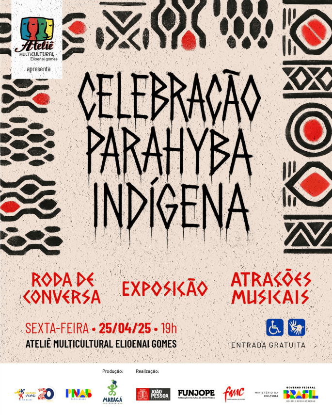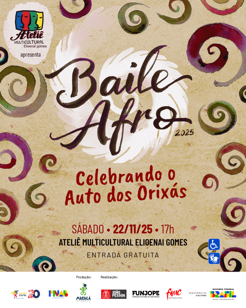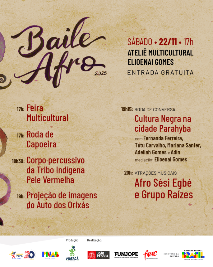 O evento #AteliêMulticulturalVivo é uma das ações realizadas pela OSC Maracá Cidadania em parceria com o Ponto de Cultura Ateliê Multicultural Elioenai Gomes em 2025 com recursos do Edital de Chamamento Público nº 60.012/2024 da Política Nacional Aldir Blanc de Fomento à Cultura (Lei nº 14.399/2022), por meio do Ministério da Cultura/Governo Federal e do Fundo Municipal de Cultura/Fundação Cultural de João Pessoa/Prefeitura Municipal de João Pessoa.