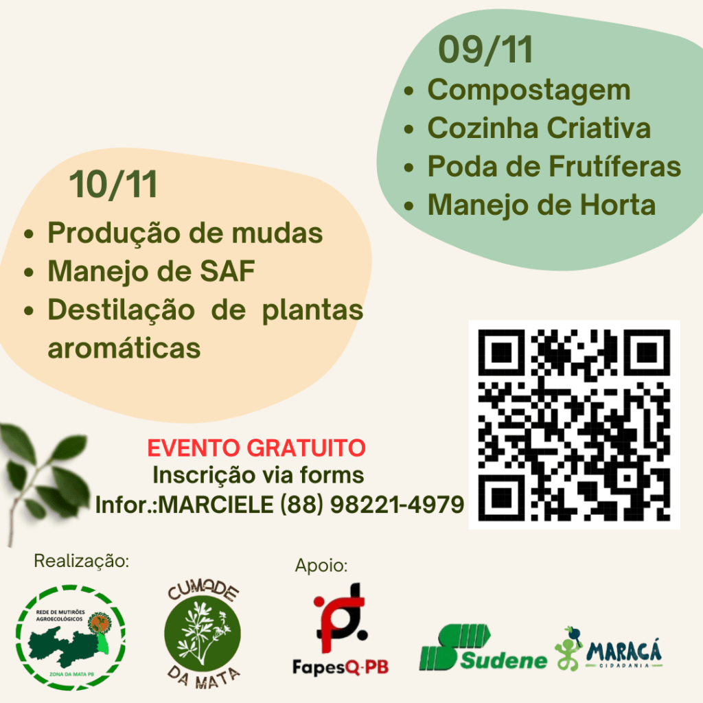 Vem aprender, trocar saberes e fortalecer a agroecologia com atividades como manejo de horta, produção de mudas, cozinha colaborativa, destilação de plantas aromáticas e muito mais!