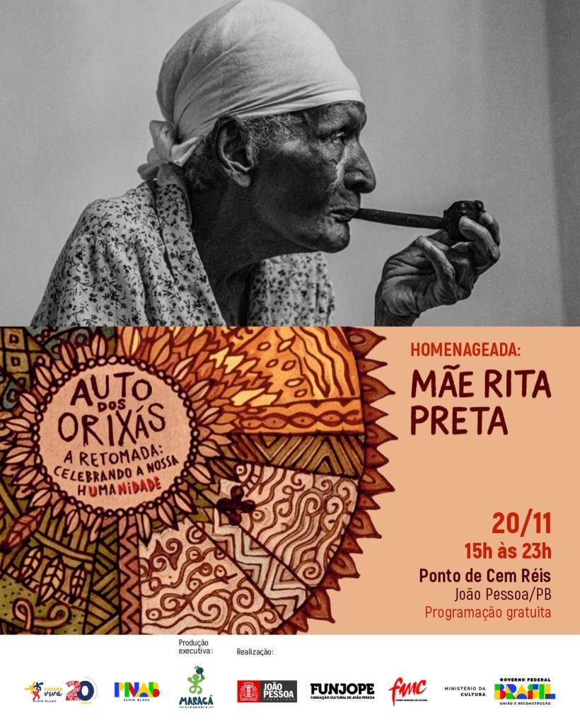 A tarde começa com a Feira Afro e Cultural, um espaço de trocas, saberes e criações. Em seguida, a Roda de Capoeira abre os caminhos para o som do grupo Sessí Egbe, preparando o público para o momento central do evento: o Auto dos Orixás, que terá início às 19h. Nesta edição, o espetáculo homenageia Mãe Rita Preta, mestra que simboliza a força das tradições e a resistência do povo negro. O encerramento fica por conta do Grupo Raízes, às 21h30, celebrando a noite com música, dança e energia ancestral.