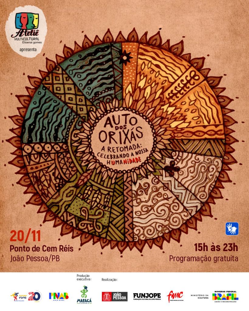 O Auto dos Orixás é uma das ações promovidas pelo Ponto de Cultura Ateliê Multicultural Elioenai Gomes em 2025 com recursos do Edital de Chamamento Público nº 60.011/2024 da Política Nacional Aldir Blanc de Fomento à Cultura (Lei nº 14.399/2022), por meio do Ministério da Cultura/Governo Federal e do Fundo Municipal de Cultura/Fundação Cultural de João Pessoa/Prefeitura Municipal de João Pessoa e com a produção executiva da associação Maracá Cidadania.