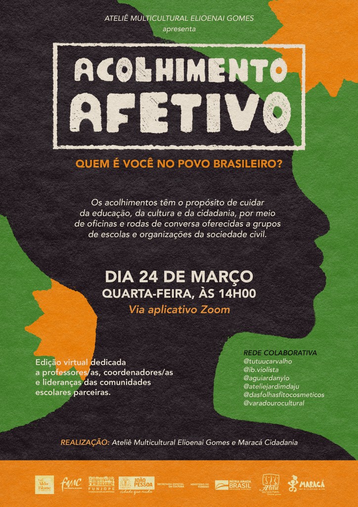 Agora em 2021, com o tema “Quem é você no povo brasileiro?”, mais uma vez o Ateliê Multicultural e a Maracá Cidadania se unem para oferecer uma edição virtual do Acolhimento Afetivo aos/às professores/as, coordenadores/as e lideranças das comunidades escolares parceiras, no dia 24 de março, quarta-feira, às 14h00, via aplicativo Zoom, com o objetivo de proporcionar um espaço de diálogo e troca de saberes sobre questões ligadas (i) à identidade cultural brasileira e (ii) ao papel da arte como ferramenta de humanização, educação e transformação social.